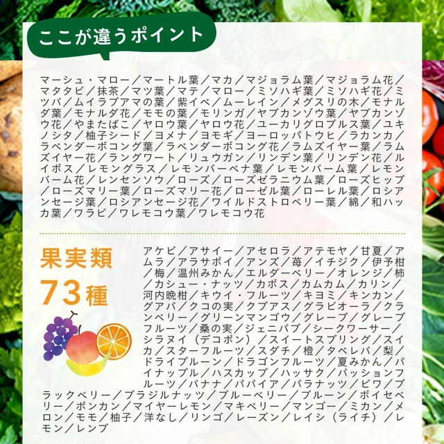 - Порошок екстракта ферментованих рослин (декстрин, екстракт ферментованих рослин) (містить пшеницю, апельсин, кеш'ю, ківі, кунжут, сою, банан, ямс, яблуко) (виробництво Японія)