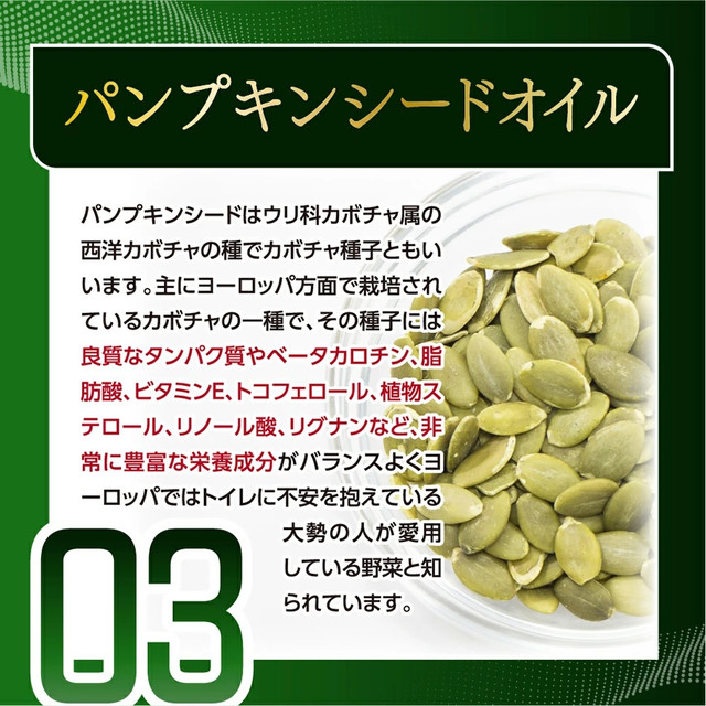 Олія з насіння гарбуза містить рослинні стероли, жирні кислоти та антиоксиданти, які підтримують нормальну роботу простати та сечового міхура, допомагаючи запобігти дискомфорту, пов'язаному з частим сечовипусканням та іншими віковими змінами.